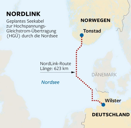 NordLink是首個(gè)銜接德國(guó)和挪威電網(wǎng)的互聯(lián)體系,被視為可再生動(dòng)力交流的高度互補(bǔ),由于德國(guó)的風(fēng)能和太陽(yáng)能發(fā)電場(chǎng)以及挪威的水力發(fā)電廠能夠作為德國(guó)進(jìn)口動(dòng)力的“動(dòng)力庫(kù)”。